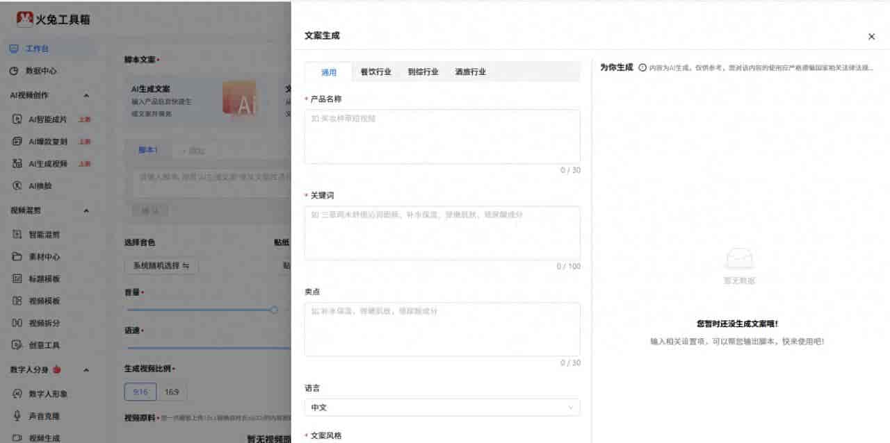 火兔工具箱专为电商品牌、实体商家、自媒体创作者打造,不管你是做美妆、服饰,还是食品、家居带货,都能适配,而且零基础也能上手。它的AI一键成片功能特别省心,只要上传产品素材、输入带货文案,就能自动匹配背景音乐、字幕和转场,生成的视频完全符合抖音、视频号、淘宝光合等电商平台调性,不用再手动调整。