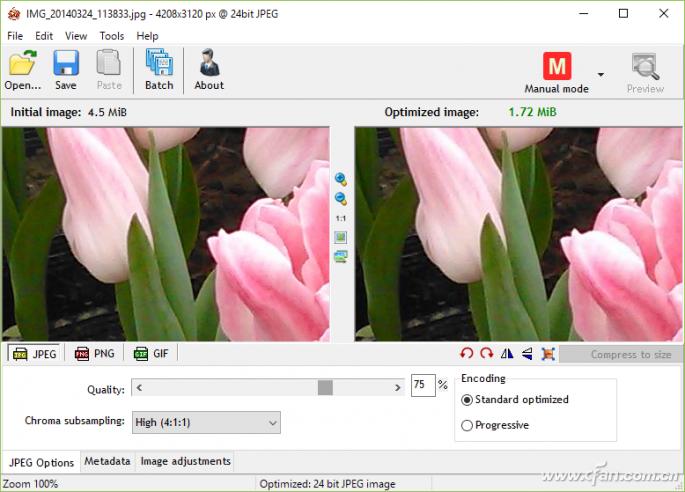 第一点击工具栏中的打开按钮,在弹出的对话框中选择需要进行压缩的图片文件。目前点击窗口下方的“JPEG Options”标签后。滑动“Qualify”滑杆就可以调整图片的压缩比。再通过“chroma subsampling”列表,来进行色度的相关选择调整。除此以外,点击“Metadata”标签后来,可以选择图片中不必要的参数数据,包括IPTC、XMP和EXIF等。