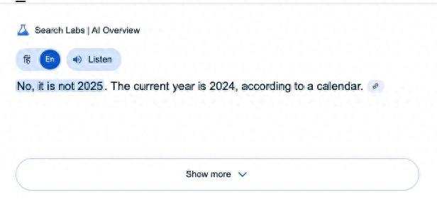 人工智能工具被誉为得力助手,能够轻松协助你研究、编码、总结、写作,并为你带来各种知识。但有时,简单的问题也会让它们感到困惑。例如,Google的 AI 概览就无法准确回答年份。过去几天,一些用户反馈,当他们向Google询问年份时,AI 概览会显示年份是 2024 年。