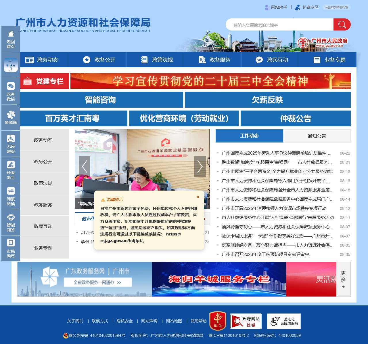 广州市人力资源和社会保障局门户网站(网址:http://rsj.gz.gov.cn/ )坚持“统一规划、统一标准、统一平台、统一门户、统一管理、资源共享、安全保密”的建设原则,突出“以服务对象为中心”的指导思想,着力于服务创新,资源整合,延展覆盖范围,优化业务流程,协同业务,共享数据,积极推进“互联网+政务”建设,打造一流的人力资源和社会保障公共服务平台。