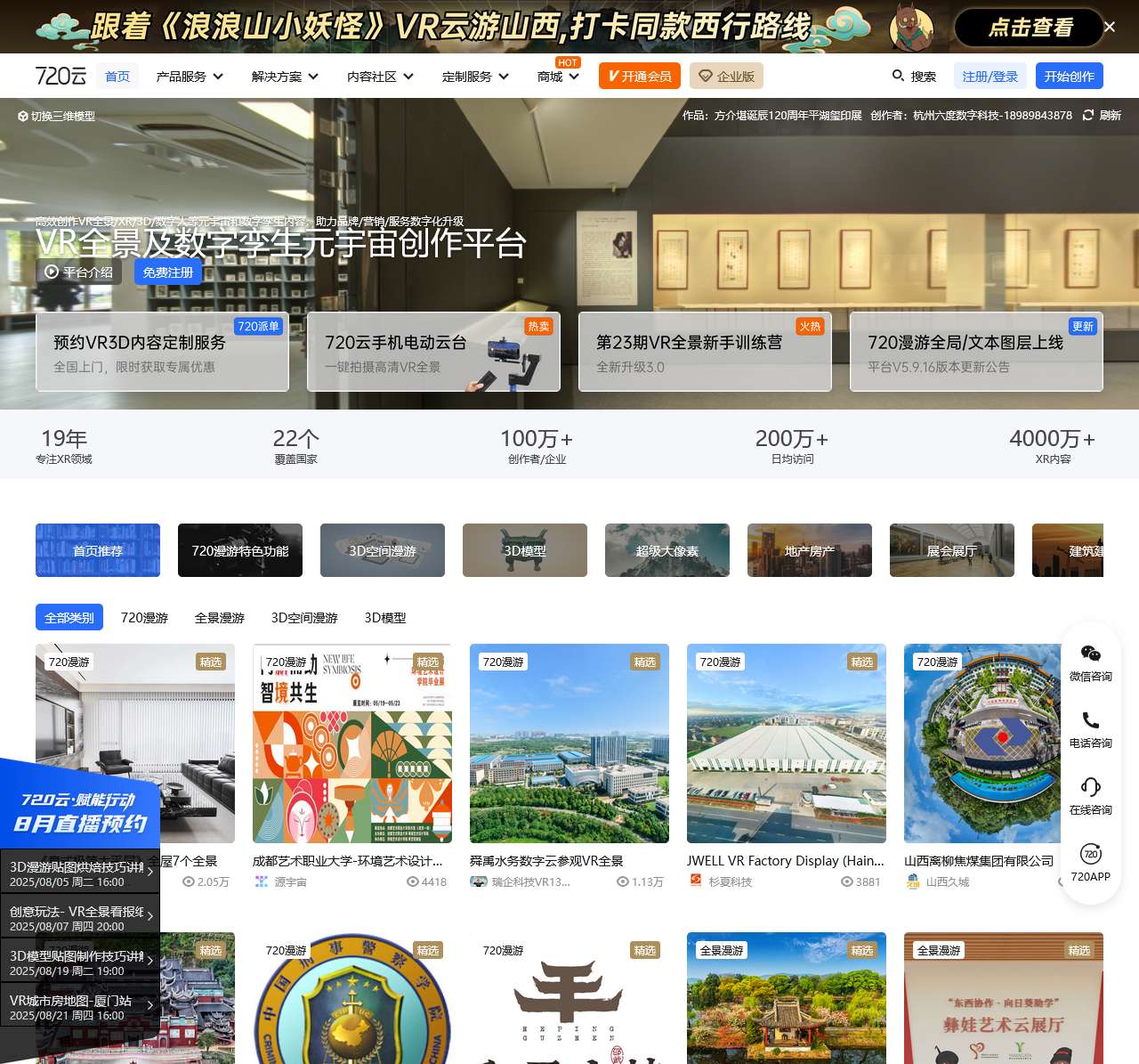 720云是技术领先的3DVR全景软件网站,为创作者和企业提供360度VR全景拍摄、VR全景制作、VR全景地图、VR全景图片、VR全景视频等展示、分发、技术支持、内容定制的一站式服务,助力商企提升品牌宣传和营销转化效果。
