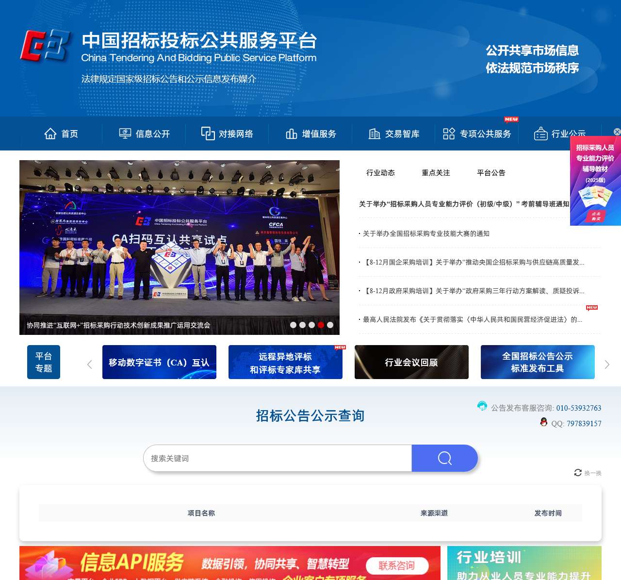 中国招标投标公共服务平台是经国务院批准、由国家发展改革委指导建立的国家级电子招标投标公共服务平台,定位是全国招标投标信息共享的枢纽、公共服务的载体和政府监管的重要依托,于2015年正式上线运行,并获2016年度中国“互联网+”十大优秀案例奖项。
