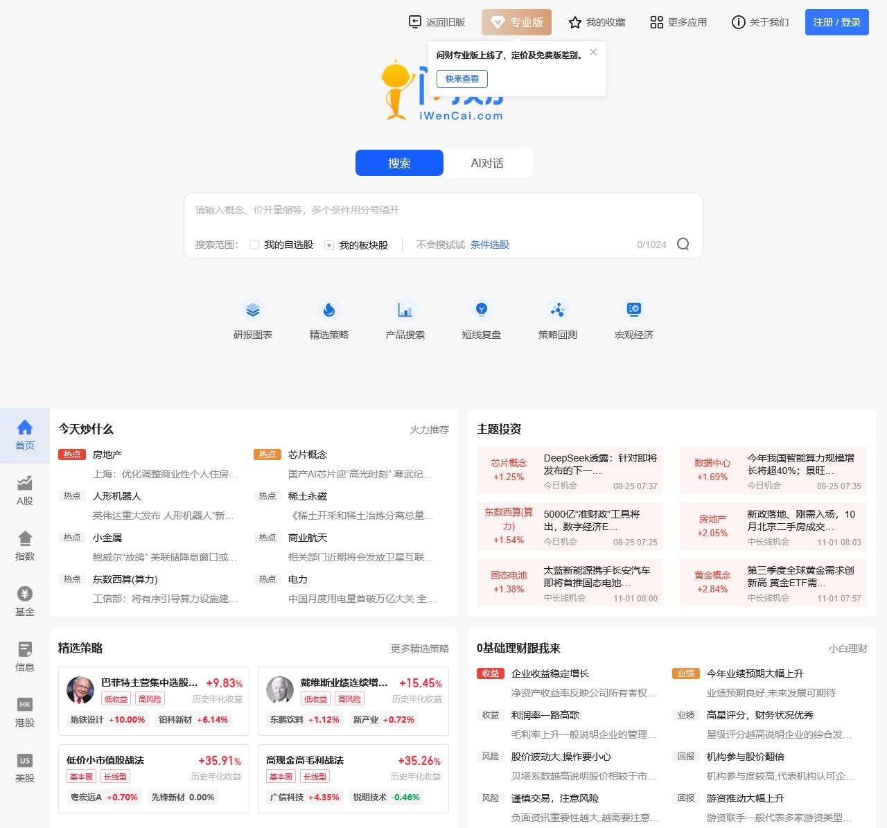 同花顺旗下专业的智能选股平台,通过AI技术致力于为股民提供智能选股、量化投资、技术分析、快速选股等服务,覆盖股票、指数、美股、港股、行情、基金、新三板、债券、期货、外汇、科创板、保险、理财、宏观、资讯、百科等信息,从而有效提高投资者的投资逻辑和效能