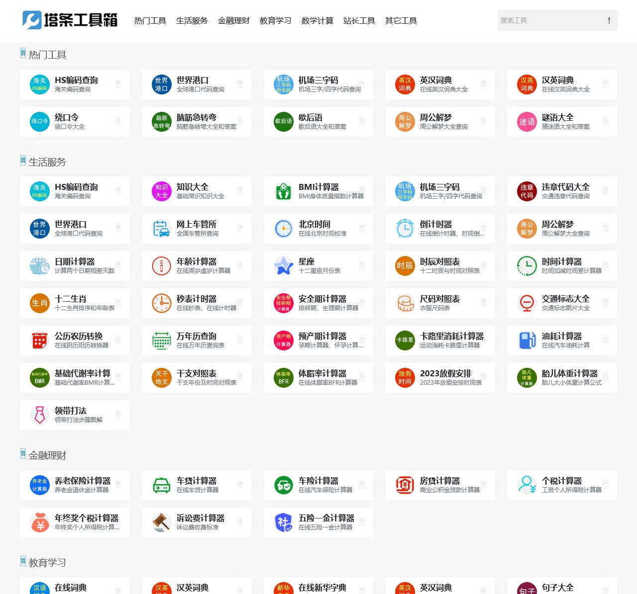 塔条工具箱是一款功能众多、实用有趣在线工具免费使用网站。包括教育学习、生活服务、金融理财、数学计算和站长查询等工具,希望对您工作和学习有所帮助。
