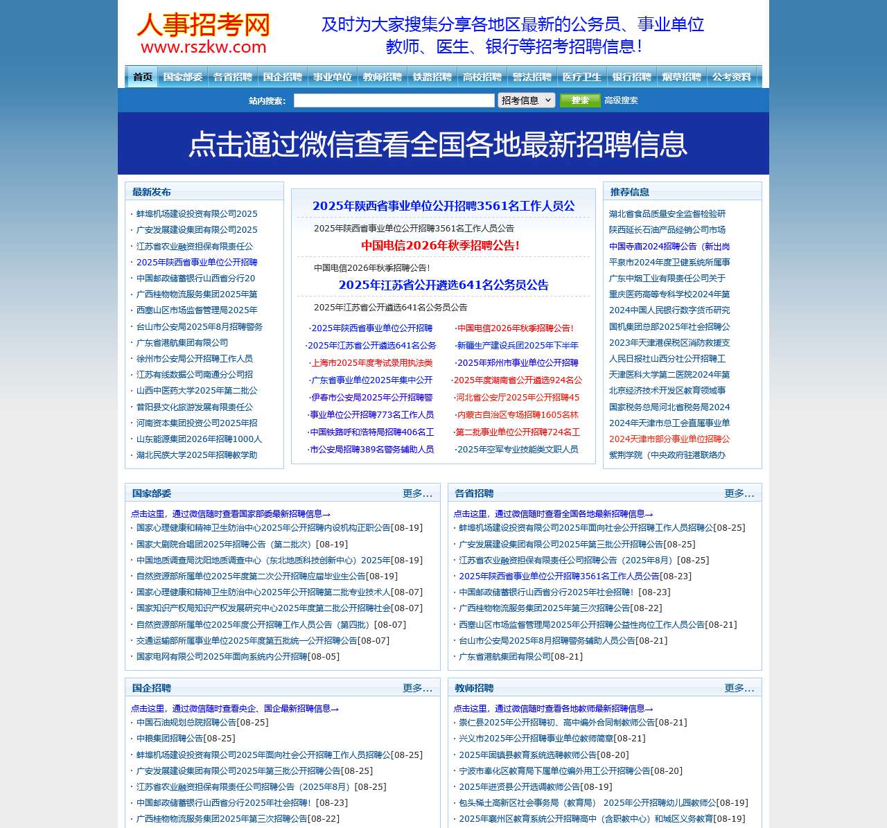 人事招考网(www.rszkw.com),及时为大家分享各类招考招聘信息,让大家通过我们,即可第一时间掌握全国各地区最新公务员、事业单位、教师、医生、银行、国企等招考招聘信息。