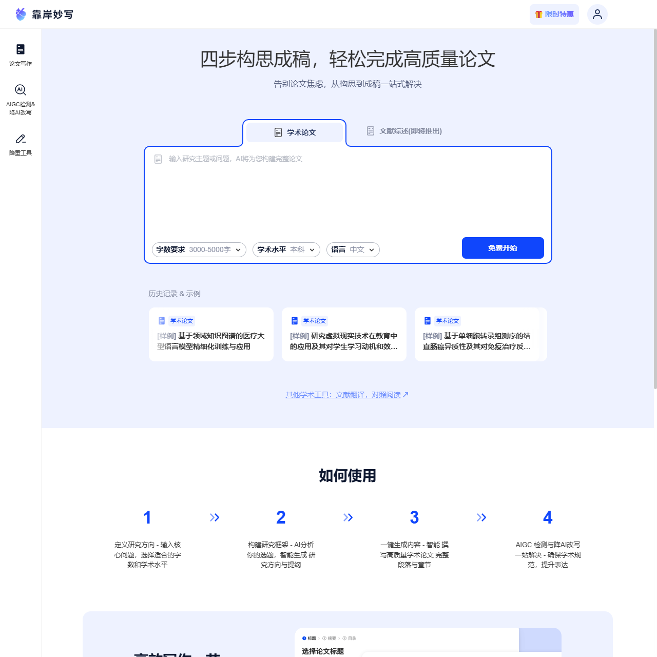 靠岸妙写是AI学术论文写作平台。AI一键生成万字论文初稿,免费摘要、大纲。同时查论文ai率,去aigc痕迹,速过多平台ai检测。