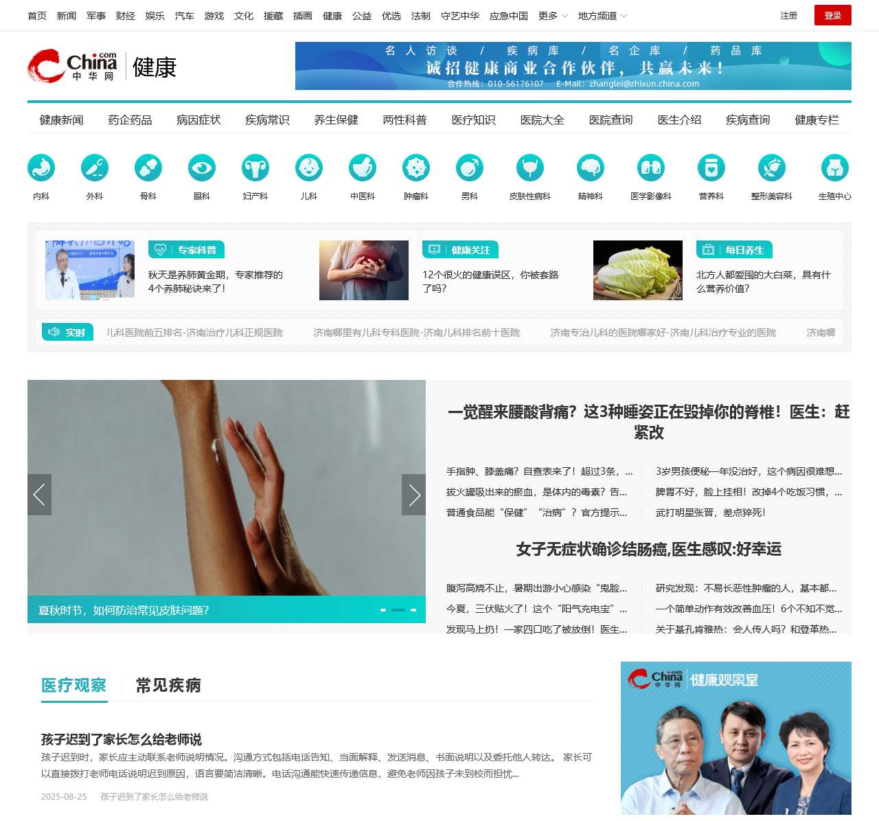 中华网健康频道为广大网民提供专业的健康知识,包含医疗健康、保健、母婴育儿、养生健康等内容。追踪健康焦点事件,报道专业医疗科研成果,凭借丰富的医疗资讯和专业的技术为网民提供健康、营养、医疗等健康知识和服务。