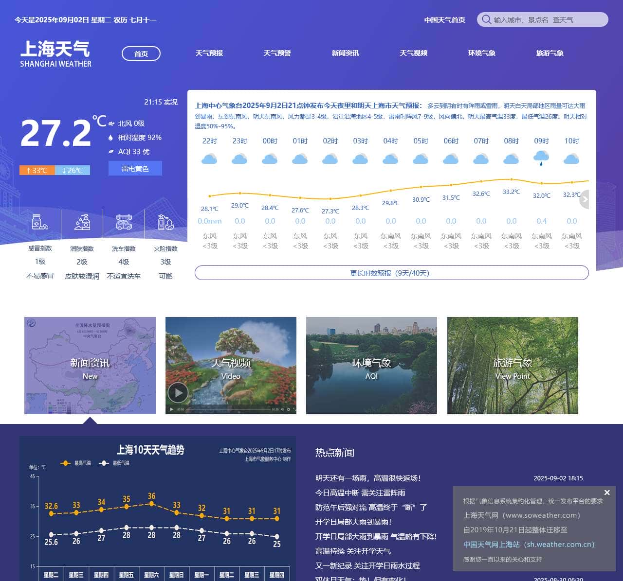 上海天气预报,上海天气预报还提供上海各区县的生活指数、健康指数、交通指数、旅游指数,及时发布上海气象预警信号、各类气象资讯。