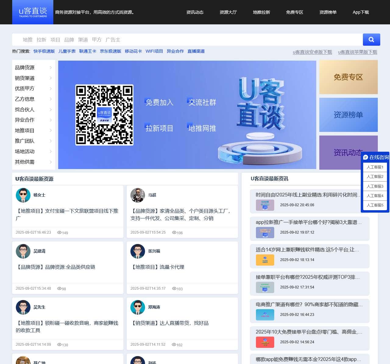 u客直谈商务资源对接平台是链接资源人脉与客户的平台,也是地推app接任务平台、地推拉新团队接单平台。平台汇聚100W+商务资源,地推拉新、APP推广、BD异业合作等业务可免费发布。同时全国的地推团队和个人都可在地推接单平台找到赚钱项目和分享交流地推问题。