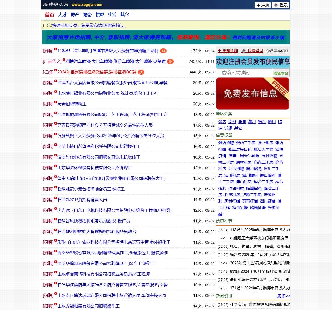淄博供求网,淄博信息港(www.zbgqw.com)免费发布淄博便民供求生活分类信息,是覆盖淄博招聘、淄博租房、淄博房产、淄博二手房、淄博二手车、淄博征婚、淄博二手等信息的综合性网站。