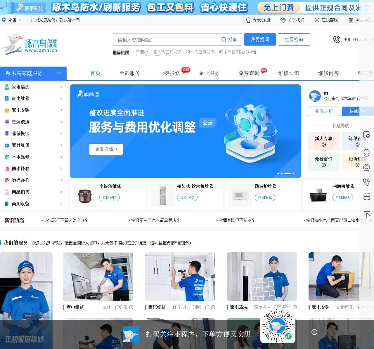 啄木鸟家庭维修(www.zmn.cn),一站式数字化家庭维修服务企业,覆盖逾300个主要家电和家居设施类别,为千万中国家庭提供透明、可信的家庭维修服务。啄木鸟维修官方客服电话:400-017-1110、400-626-6218。正规家庭维修,就找啄木鸟。