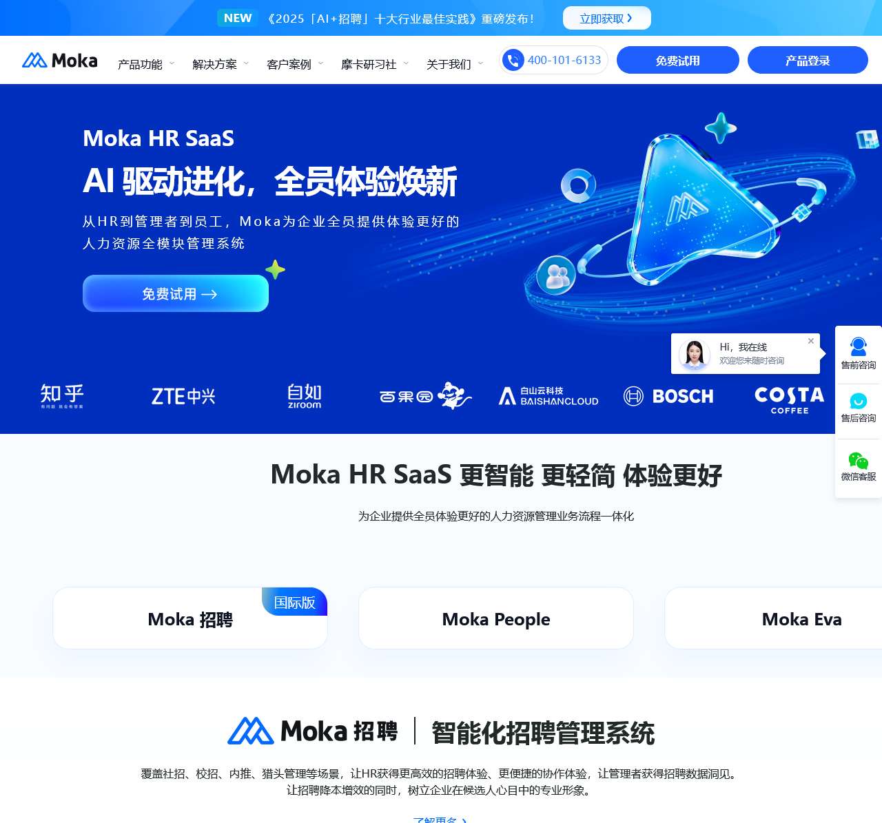 MokaHRSaaS人力资源管理系统提供全面的招聘管理系统与人事管理系统,功能涵盖招聘管理、员工入离职管理、薪酬管理、绩效管理、假勤管理、组织人事管理等,为企业打造高效的人力资源管理流程和全面的一体化HRSaaS软件,让人力资源管理更智能、更便捷。