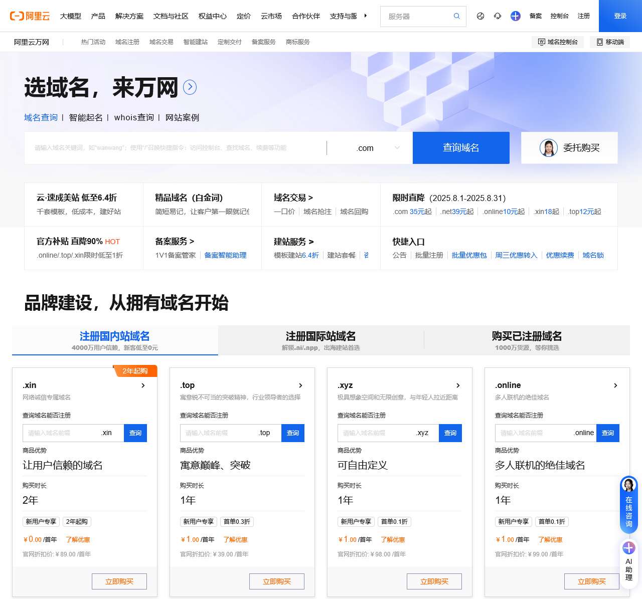 阿里云万网是阿里云旗下品牌,中国最大的域名注册服务提供商,致力于成为全球域名服务引领者,提供域名、建站、备案等上云基础服务,让创业更简单!