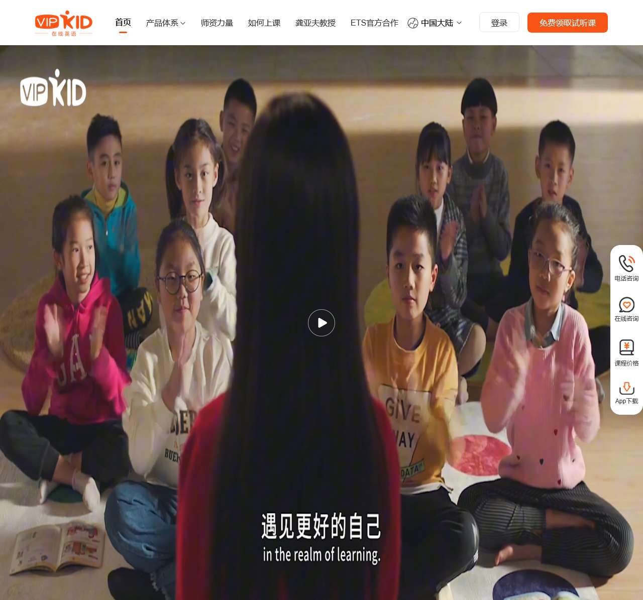 VIPKID为您提供1对1外教口语课程和英语体系课程,经8年学术沉淀,累计服务100万学员、1.5亿节课时,签约8万北美外教,100%本科学历、硕博占比33%以上,帮助您从零学英语,足不出户练口语.登录官网领免费试听课程,学英语来VIPKID!