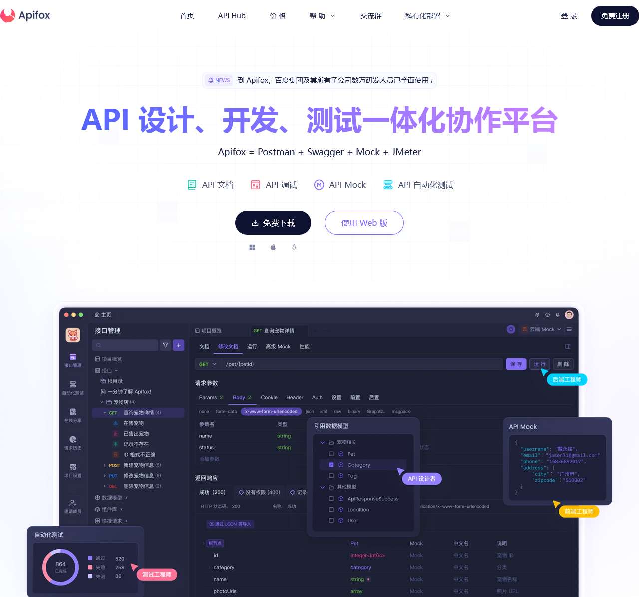 Apifox = Postman + Swagger + Mock + JMeter。集接口文档工具、接口Mock工具、接口自动化测试工具、接口调试工具于一体,提升 10 倍研发效率。是最好用的API文档工具,API自动化测试工具,API Mock工具,接口文档管理工具,接口文档生成工具。
