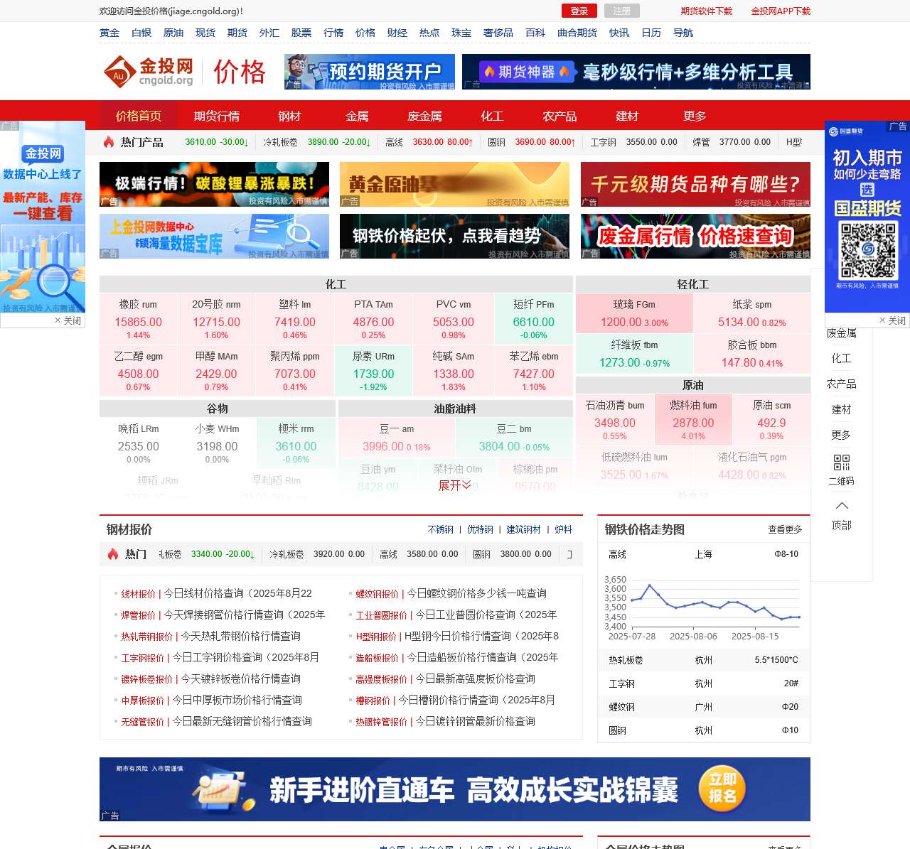 金投价格提供贵金属价格行情,期货价格行情,石油价格行情,钢材价格行情,有色金属价格行情,生猪价格行情,粮食价格行情,农产品价格行情,化工价格行情,塑料价格行情等各行业价格行情走势查询服务。