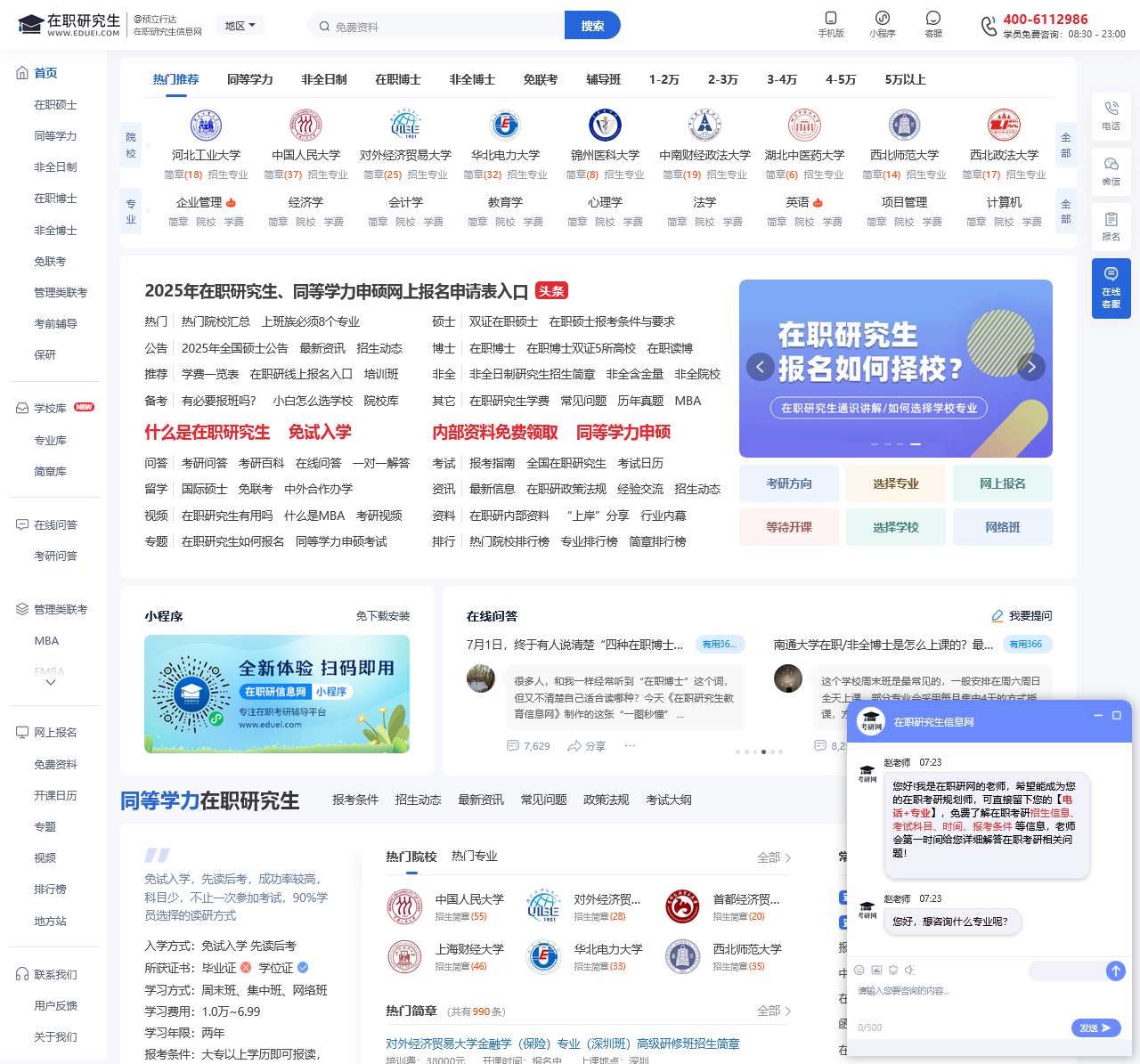 网站的有关在职研,在职博等的相关信息比较全面,方便我们全面了解,在线客服老师专业,帮助想就读的同学省时省力的选择。