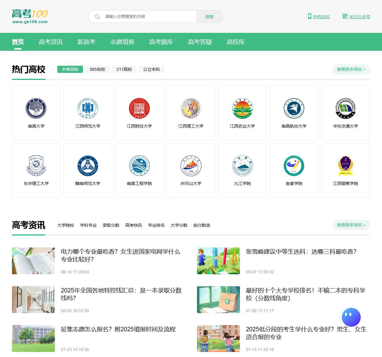 高考100提供大学排名、专业排名、高校动态、志愿填报、位次表、大学录取分数线、高考真题下载、高考热门答疑等有用内容,是专注服务于高三学生的网站。
