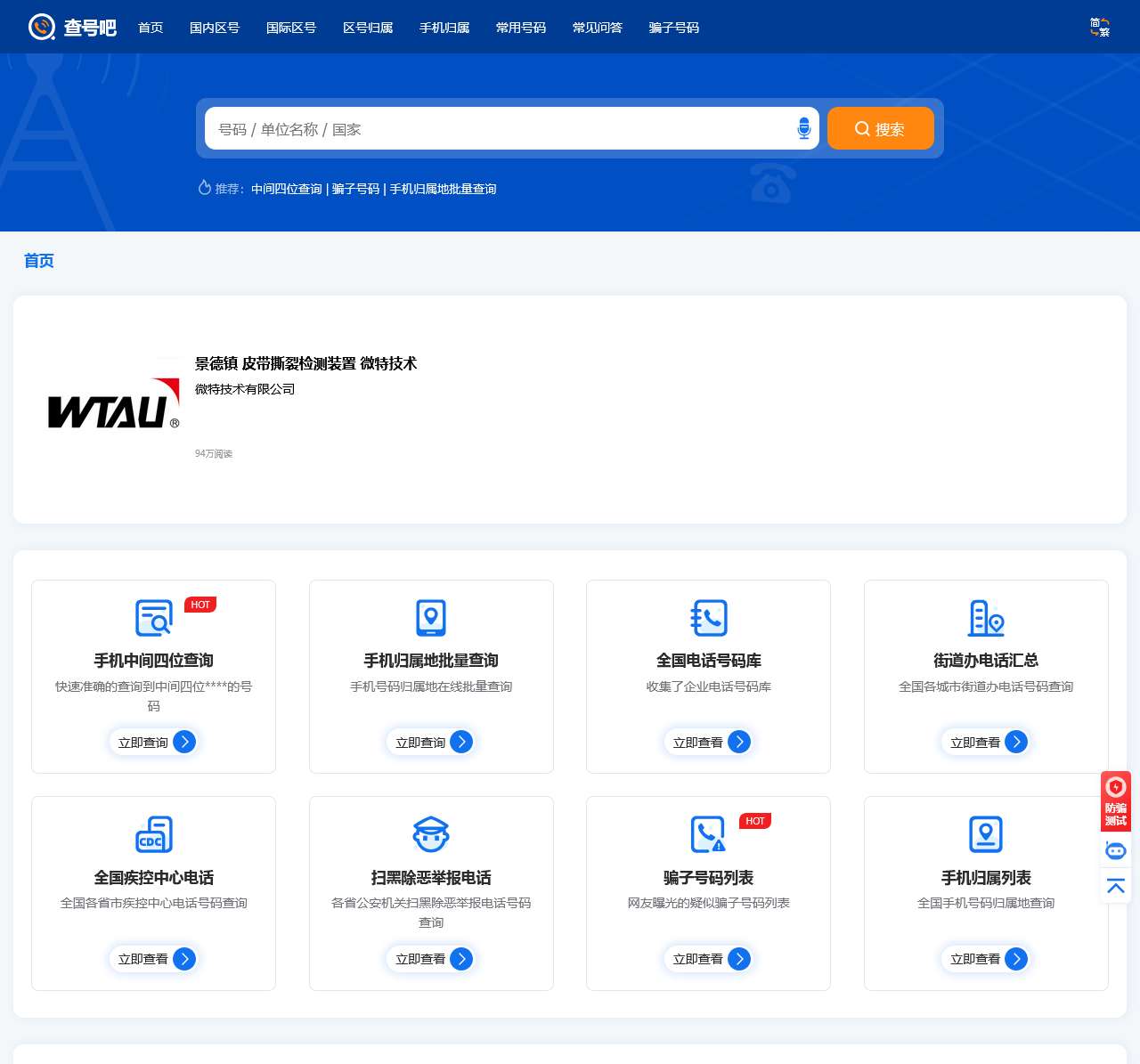 查号吧网站已经提供超过20年的国内国际长途电话区号、手机归属地查询、骗子号码曝光、固定电话号码库等服务,具有多语言版本、可适配智能手机、平板电脑以及app版本和微信小程序,是您查询电话区号、手机归属、特殊号码的方便、可靠帮手!