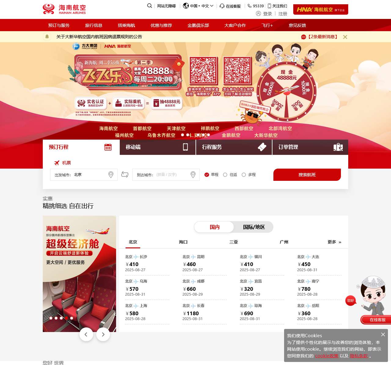 海南航空官网,提供国内国际机票预订,航班查询,特价机票打折机票预订,机加酒预定,金鹏会员服务等,海航官网官网预订机票价优保障,海航24小时服务热线95339