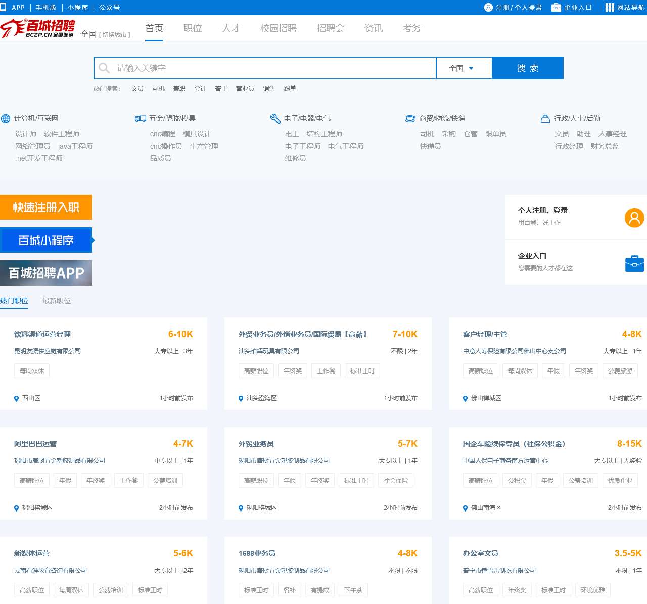 百城招聘网(www.bczp.cn)是广东百城人才网络股份有限公司旗下的网站,百城人才求职招聘理想选择,百城人才网站中访问量最高、人气最旺的百城人才网站,目前百城招聘网拥有超过100万份各行人才精英简历,每天超过1万个招聘信息更新发布,百城招聘网致力于打造百城人才招聘网络市场最佳品牌。鹰潭博谦企业服务有限公司 大专以上 | 3年 汕头市壹...