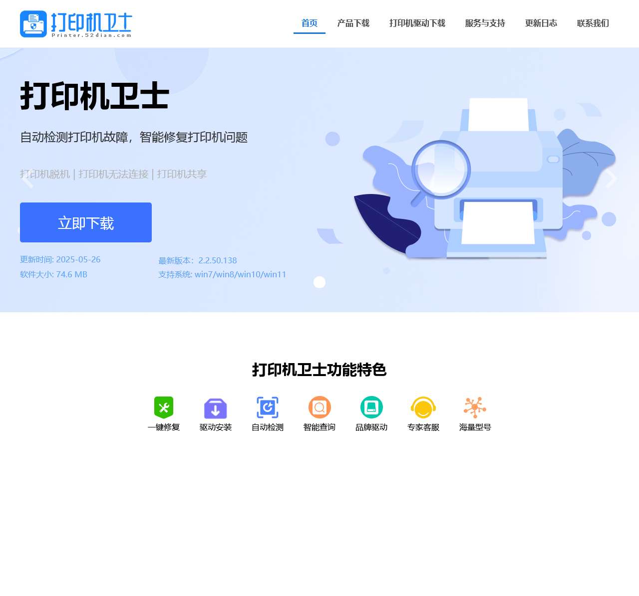 打印机卫士支持一键修复打印机驱动、打印机脱机、无法打印故障以及打印机共享、网络打印机、连接打印机等常见问题解决。