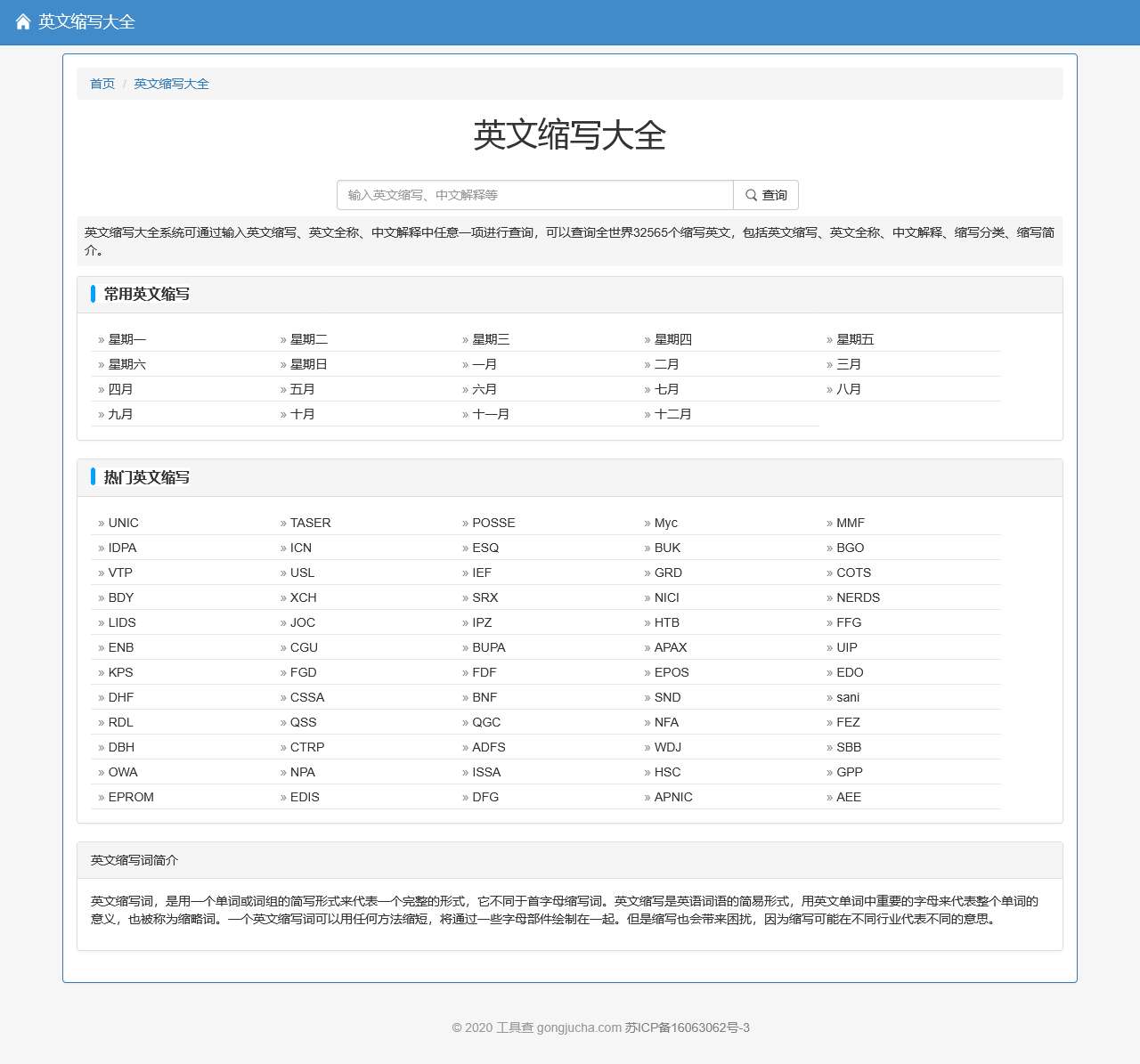 英文缩写大全系统可通过输入英文缩写、英文全称、中文解释中任意一项进行查询,可以查询全世界32565个缩写英文,包括英文缩写、英文全称、中文解释、缩写分类、缩写简介。
