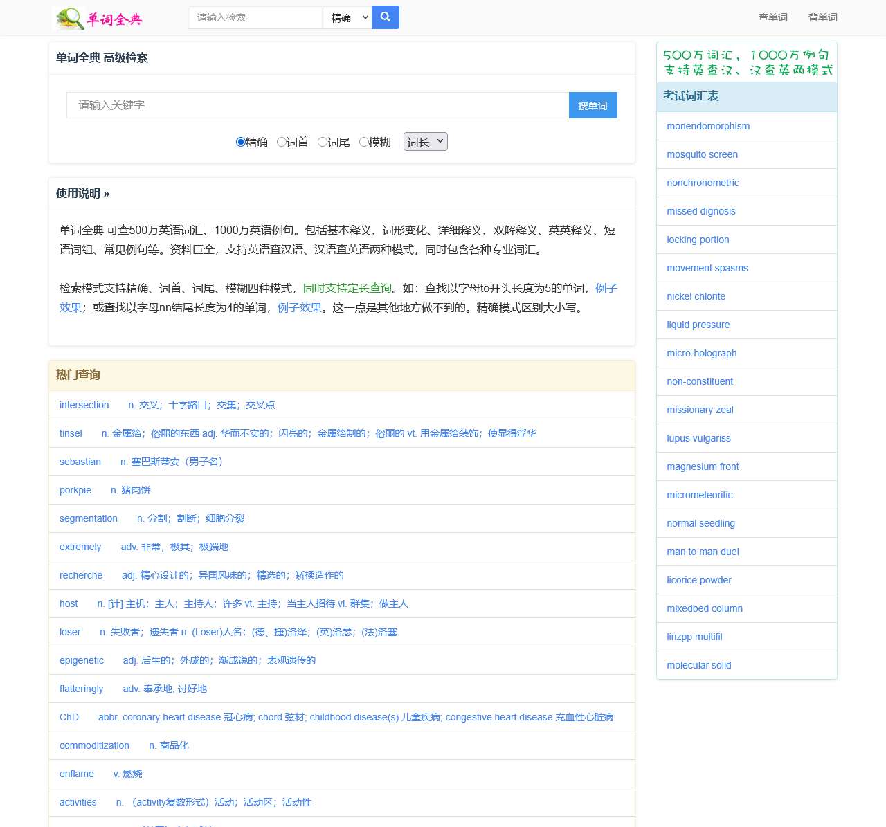 检索模式支持精确、词首、词尾、模糊四种模式,。如:查找以字母to开头长度为5的单词,;或查找以字母nn结尾长度为4的单词,。这一点是其他地方做不到的。精确模式区别大小写。