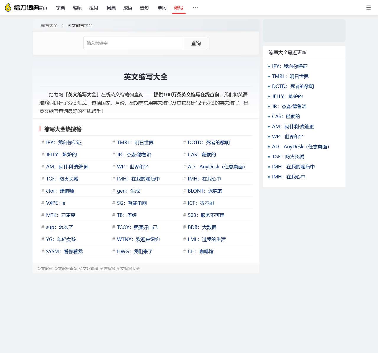 给力网「英文缩写大全」在线英文缩略词查询——提供100万条英文缩写在线查询,我们将英语缩略词进行了分类汇总,包括国家、月份、星期等常用英文缩写及其它共计12个分类的英文缩写,是英文缩写查询最好的在线帮手!
