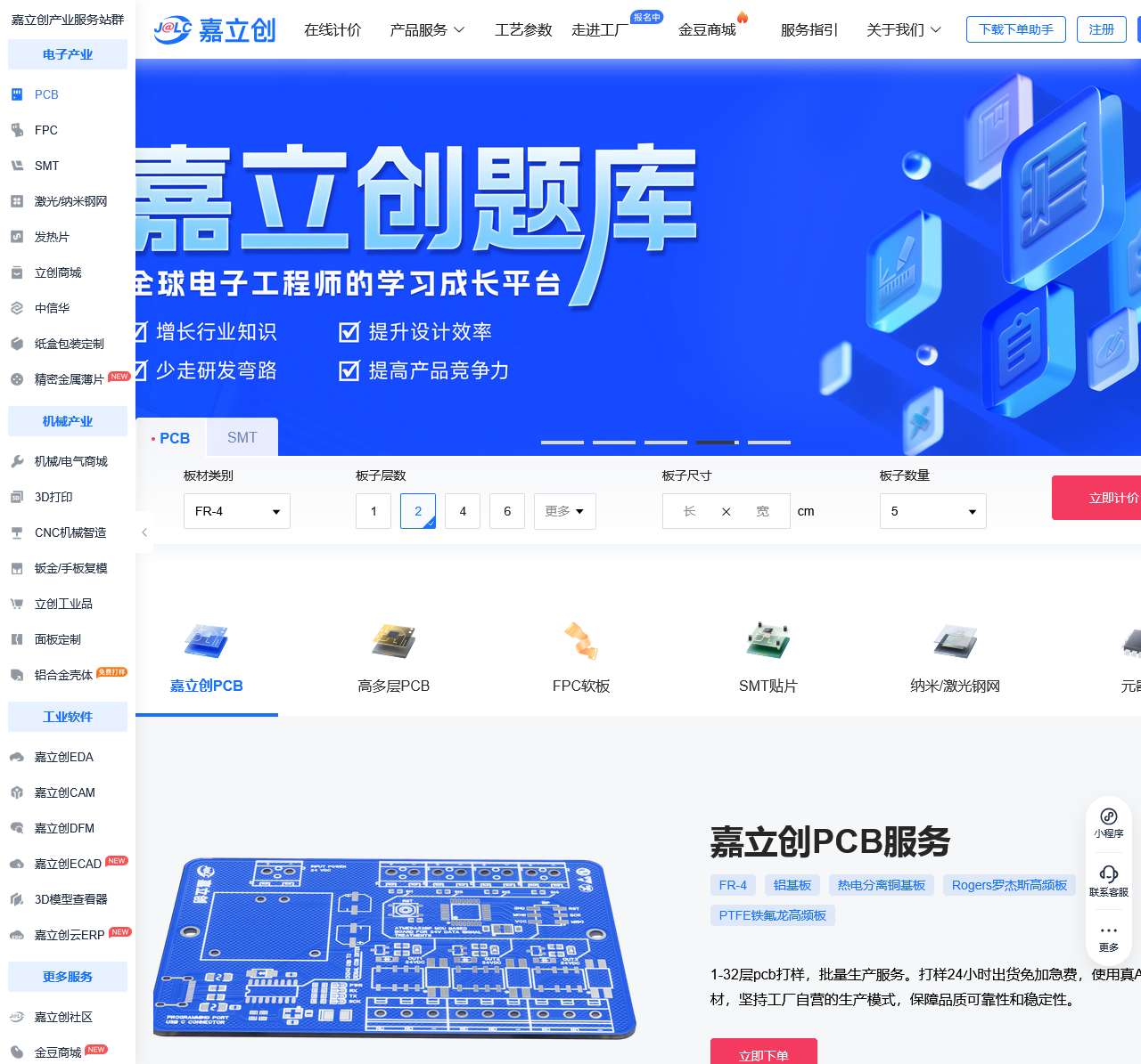 提供PCB/PCBA打样小批量、EDA/CAM工业软件、钢网、治具、FA机械零部件商城、3D打印、CNC机械智造、钣金加工等技术与服务。