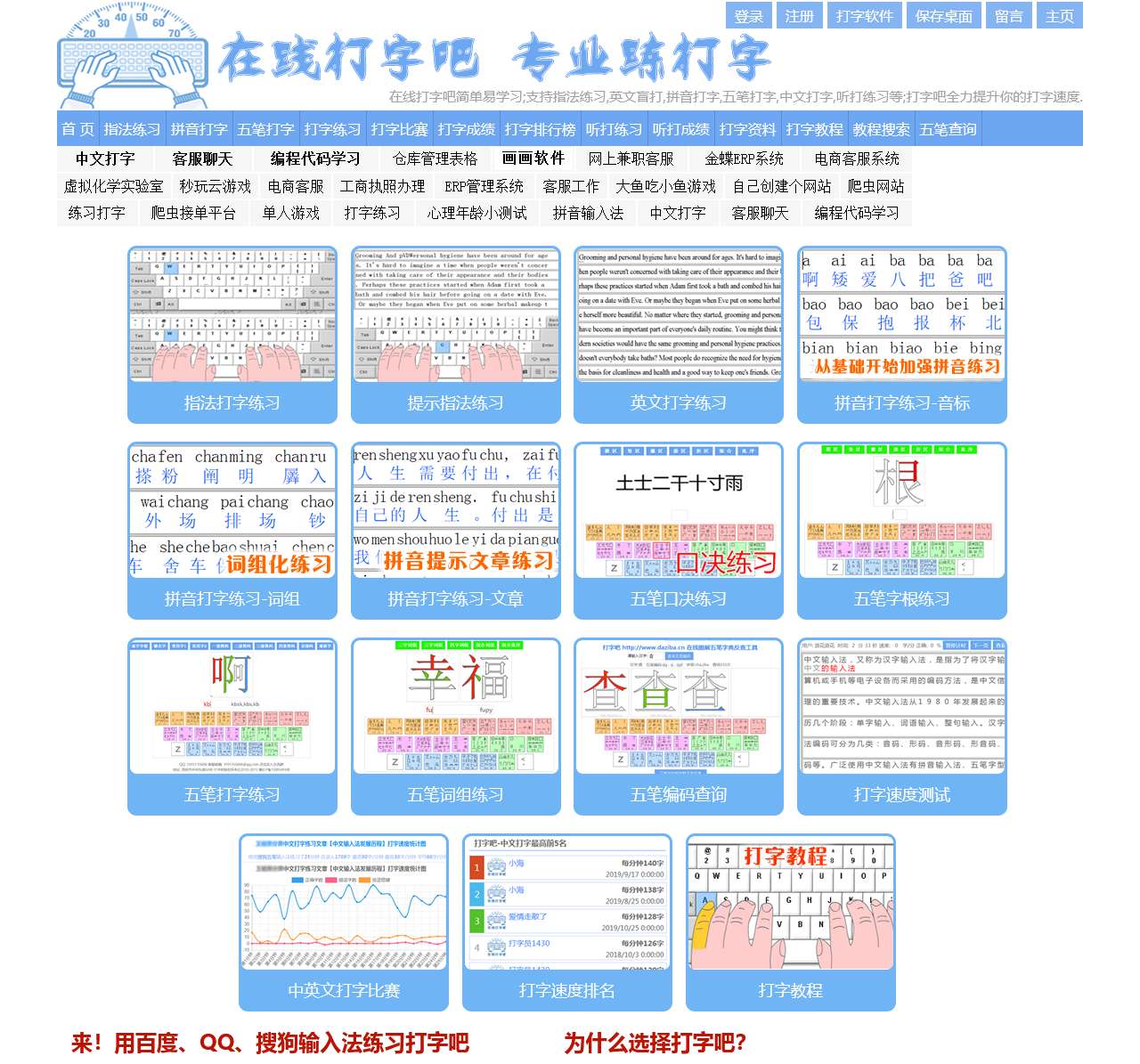 打字吧是一款在线打字练习软件,支持五笔打字,拼音打字,听打练习,听打测试,中文打字,指法练习,搜狗打字,打字速度比赛测试,让您轻松成为打字通!