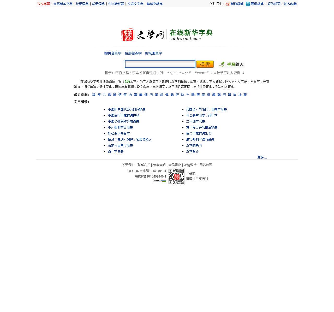 在线新华字典共收录简体、繁体2万余字,为广大汉语学习者提供汉字的拼音、部首、笔画、字义解释、同义词、反义词、同音字、英文翻译、词义解释、词性变化、康熙字典解释、说文解字、字源演变、常用词组等查询,支持拼音查字、手写输入查字。