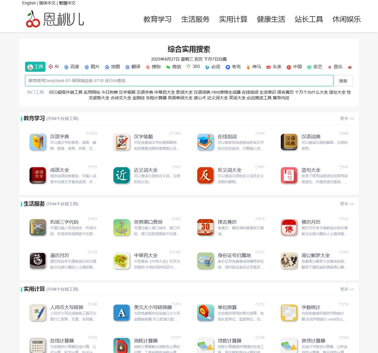 恩桃儿在线工具箱是一个提供多种免费在线实用工具的网站,涵盖便民查询、教育学习、生活服务、实用计算、健康生活、站长工具和休闲娱乐等多个领域,包含汉字工具、翻译、计算器、健康计算器、编码转换、站长工具、娱乐测试等丰富功能,旨在为用户提供便捷的在线服务。