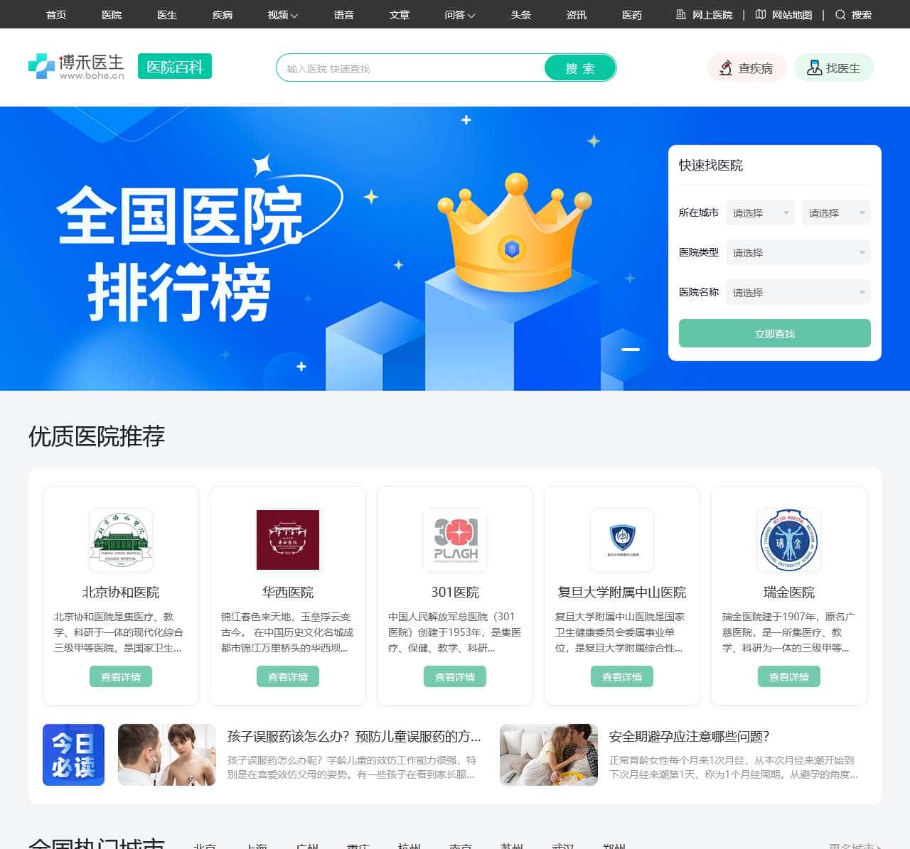 博禾医院库网上挂号平台综合全国医院排行榜和热点城市医院、科室医院及疾病专科医院大全,为用户提供医院介绍、在线咨询和网上预约挂号服务,帮您快速找到好医院,实现网上预约挂号。