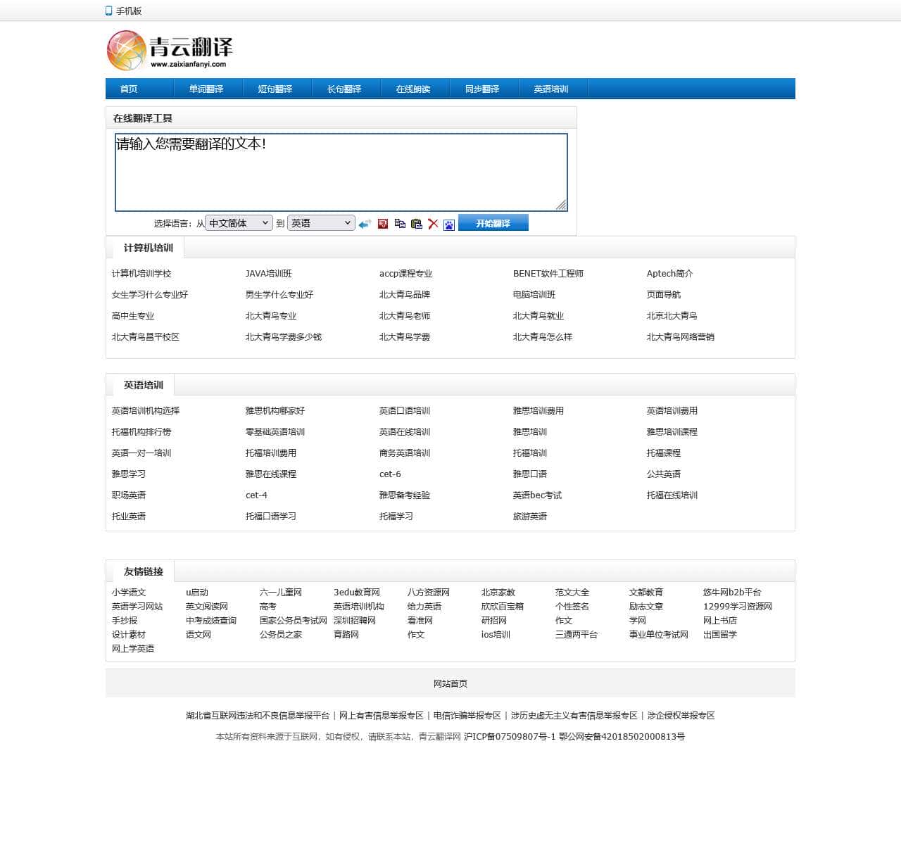 青云在线翻译网,英语,荷兰语, 法语, 德语, 希腊语, 意大利语, 日语, 韩语, 葡萄牙语, 俄语, 西班牙语的免费在线翻译服务。