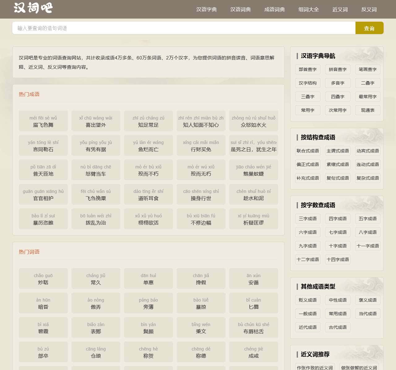 汉词吧是专业的词语查询网站,共计收录成语4万多条、60万条词语、2万个汉字,为您提供词语的拼音读音、词语意思解释、近义词、反义词等查询内容。