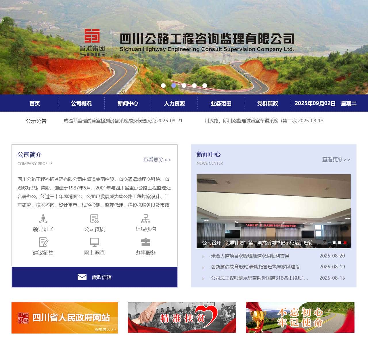 四川公路工程咨询监理有限公司由蜀道集团控股,省交通运输厅交科院、省财政厅共同持股。创建于1987年5月,2001年与四川省重点公路工程监理处合署办公。经过三十年励精图治,公司已发展成为集公路工程勘察设计、工可研究、技术咨询、设计审查、试验检测、监理代建、招投标服务以及市政道路工程勘察设计等业务。