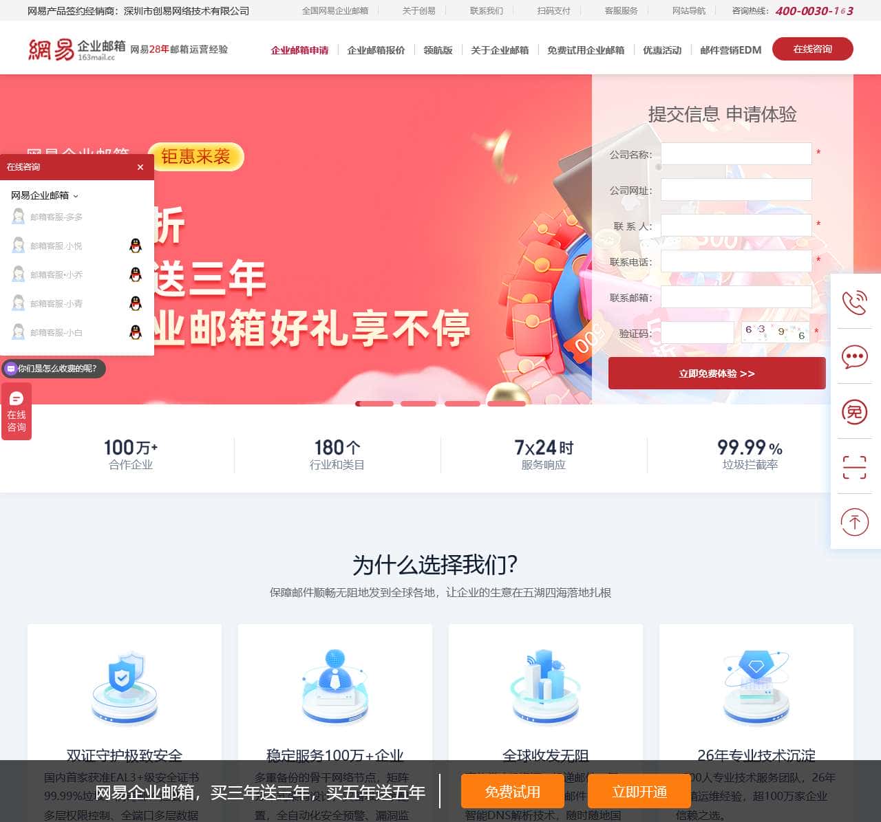 网易企业邮箱官网指定服务商.旗下163企业邮箱拥有超强反垃圾、收发,全球畅游,无限容量,安全稳定等优势,4100多万外贸企业邮箱用户支持认可,公司域名邮箱申请注册品牌,免费申请企业邮箱试用及购买电话:400-0030-163.