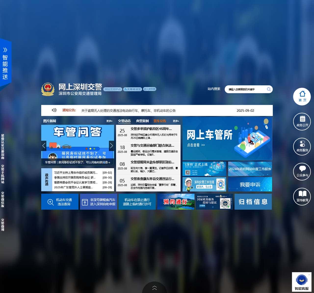 广东省深圳市公安局交通管理局互联网门户网站由广东省深圳市公安局交通管理局主办,向市民提供办事指南、网上办事、警民互动等服务。