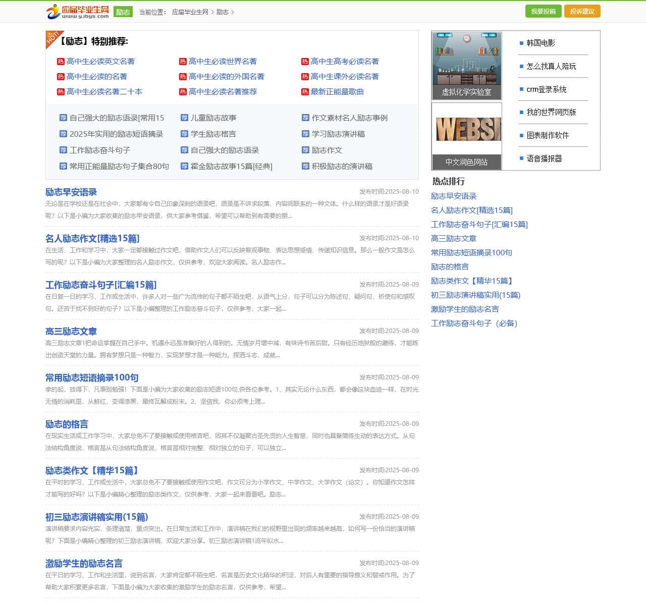 应届毕业生励志网与大家分享一些励志名言、励志文章、励志故事、励志电影、励志歌曲、励志书籍、励志演讲、励志语句、职场励志等关于励志方面的内容,激发大家的生活或工作热情,促进工作事业奋发向上。